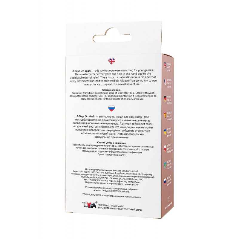 Oh Yeah! - это то, что ты искал для своих игр. Этот мастурбатор отлично ложится и удерживается в руке из-за дополнительного внешнего рельефа. А внутри тебя ждет такой натуральный внутренний рельеф, что каждое движение может привести к невероятной разрядке и ты будешь стремиться использовать каждый шанс, чтобы повторить это сексуальное приключение.