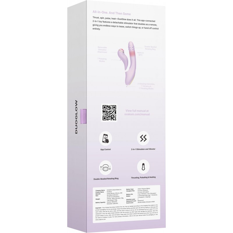 Многофункциональный вибратор Svakom DuoGlow с отсоединяемым клиторальным стимулятором — это качественная секс-игрушка формата “2в1”. Вы можете использовать вибратор и стимулятор одновременно—в роли вибратора-кролика для двойного удовольствия или снять клиторальную часть, чтобы наслаждаться каждым элементом отдельно.