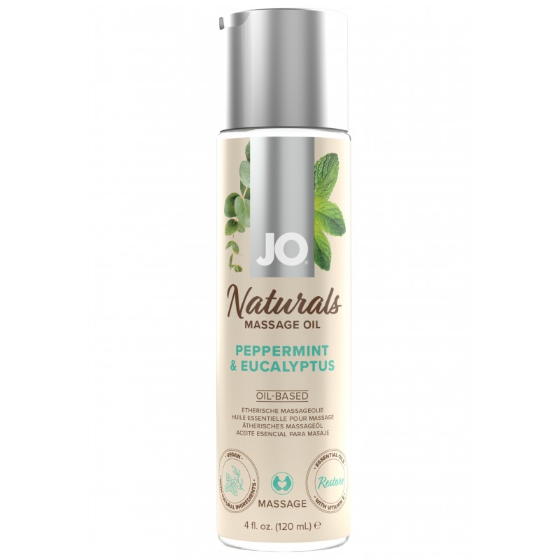 JO NATURALS Massage Oil Peppermint & Eucalyptus – эфирное масло для массажа на натуральной растительной основе с ярко выраженным ароматом перечной мяты и эвкалипта. Благодаря тщательно продуманной формуле, масло обеспечивает длительное гладкое скольжение, позволяющее при массаже уберечь кожу от негативного воздействия. Входящие в состав натуральные средства и витамин Е прекрасно увлажняют и питают кожу. Сочетание прохладной свежести мяты и древесных ноток эвкалипта освежит, улучшит настроение и придаст бодрости. Приятный и мягкий аромат создан для тех, кто хочет стряхнуть усталость, зарядиться энергией, восстановить внутреннюю силу.