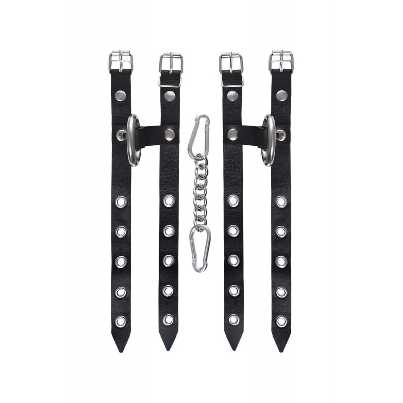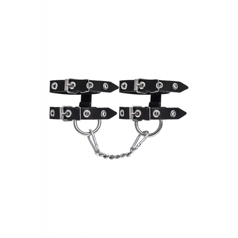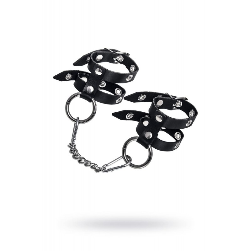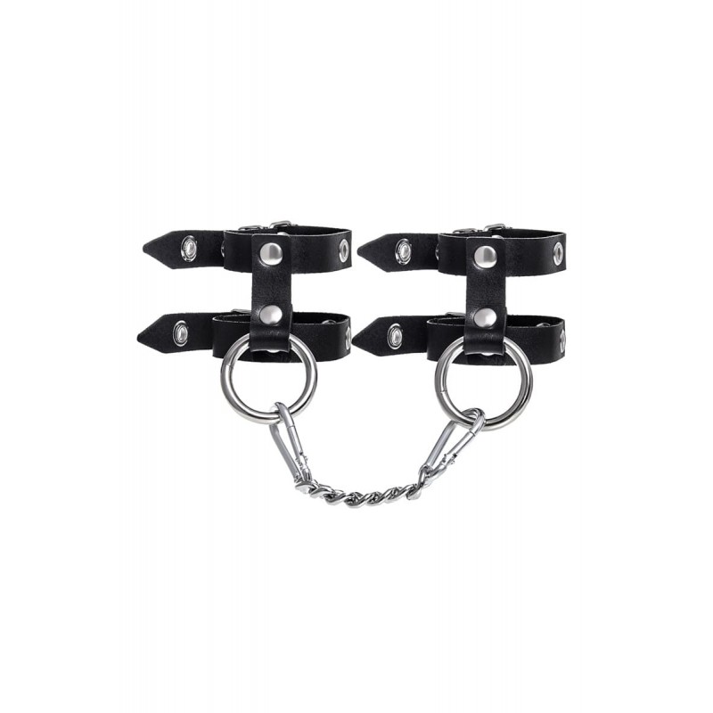 Однослойные кожаные наручники из двух ремешков могут стать стильным аксессуаром на «свободных» руках, но могут послужить вашим целям и фантазиям по своему прямому назначению. Наличие двух колец и карабинов, соединенных между собой металлической цепочкой, позволяет использовать изделие как раздельно – аксессуар-манжеты, так и как наручники для фиксации. К широким металлическим кольцам также можно присоединить и другие аксессуары при помощи карабинов. Благодаря универсальному размеру наручники могут использоваться и мужчинами, и женщинами. Размер легко регулируется с помощью металлических пряжек, органично вписывающихся в общий стиль. Ширина ремешков 1,6 см, длина манжет 25 см.