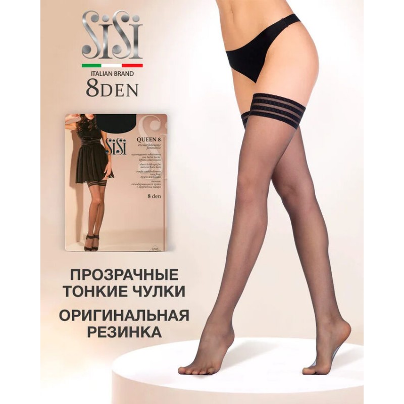 Чулки женские SiSi QUEEN 8 den - ультратонкие, прозрачные, с оригинальной резинкой "полосы" на силиконовой основе и эффектом загара. Чулки надежно держатся, не сползают, отлично облегают и практически не ощущаются на теле. Благодаря невидимому мыску модель прекрасно сочетается с открытой обувью.