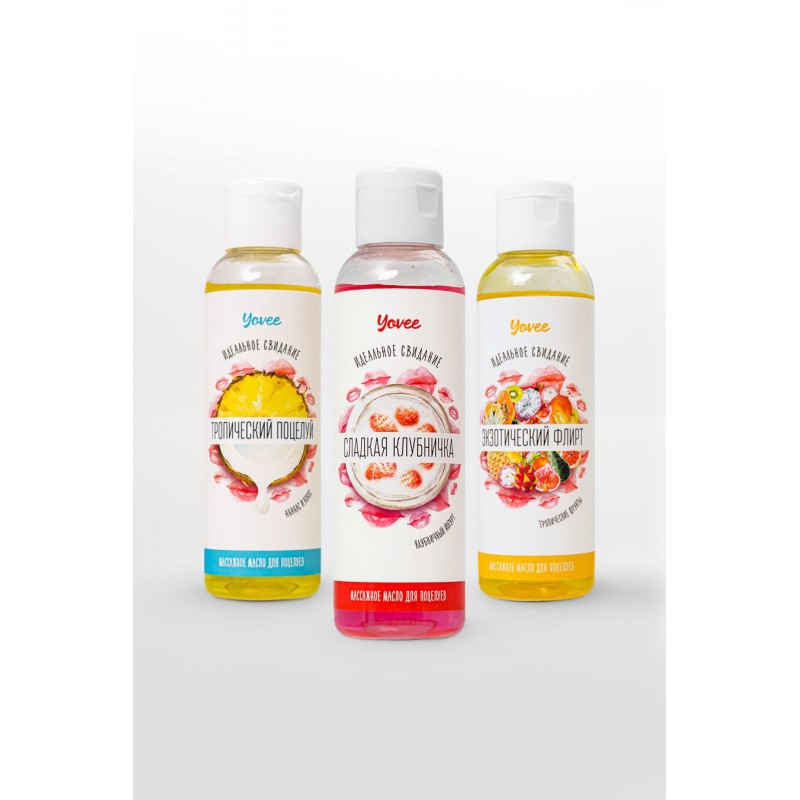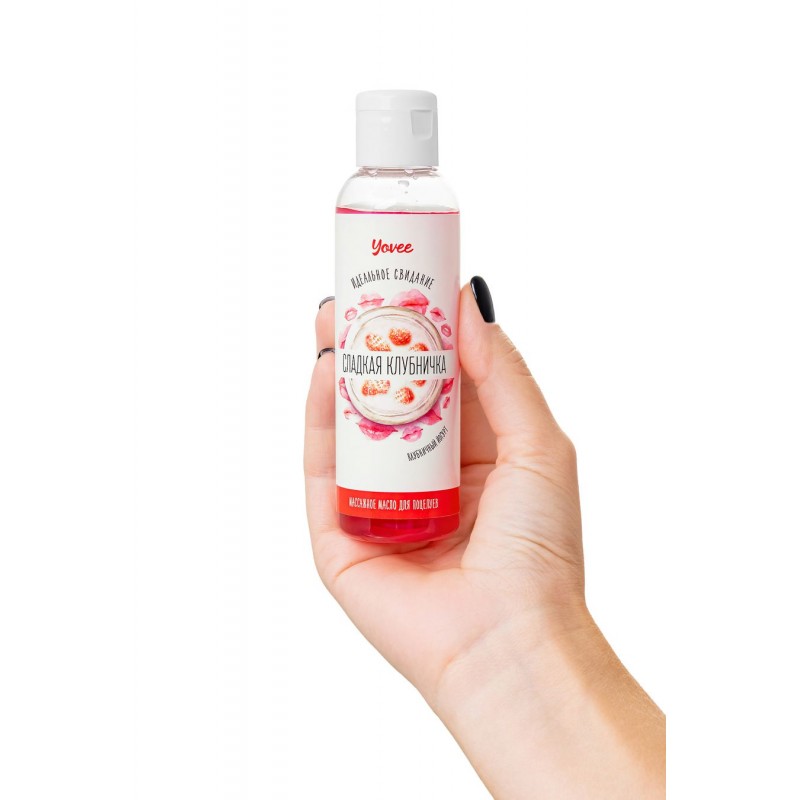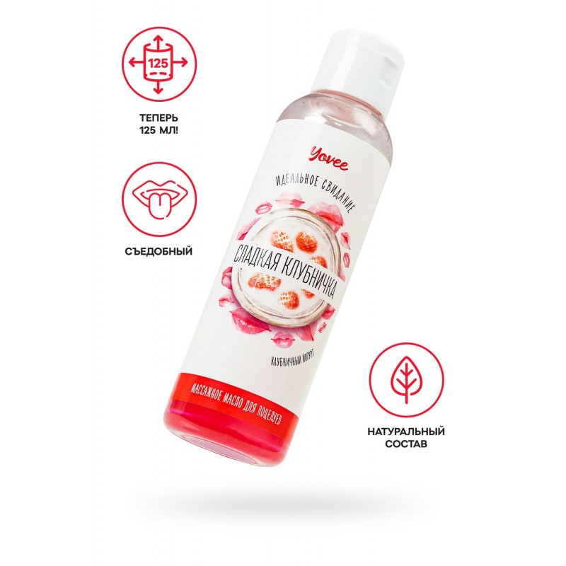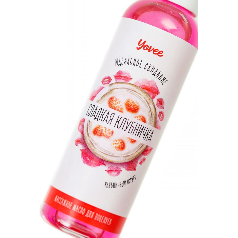 Массажное масло для поцелуев Yovee «Сладкая клубничка» со вкусом клубничного йогурта сделает свидание незабываемым. Ароматный сладкий массажный продукт дополнит парный романтический вечер или станет сочным уходовым средством для самостоятельного использования. Ощутите, как кожа наполнится влагой, станет мягкой и упругой. Яркий десертный аромат опьянит, раскрываясь на горячей коже роскошным шлейфом.